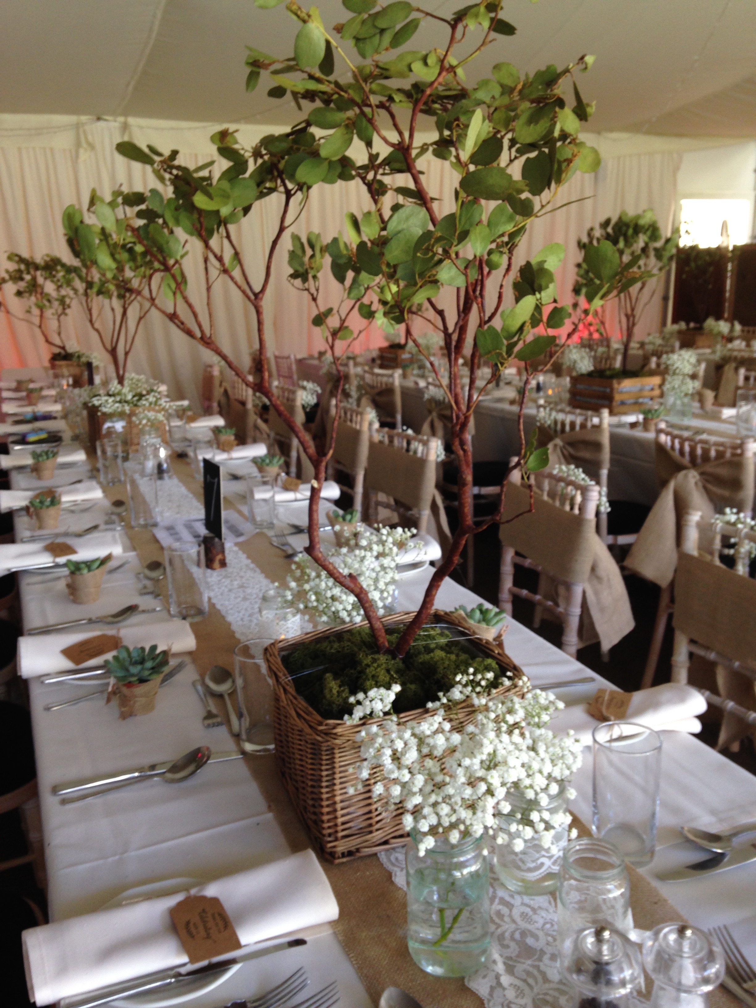 Natural Centrepieces: Why not create a real seasonal look to your tables by using Manzanita trees or twisted willow branches? For an autumn or winter wedding they look magical with glass tea light globes hanging from their branches.