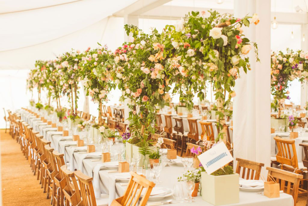This minimalist botanical wedding chose to add a twist on greenery with succulent cacti as centre pieces and wedding favours, and wild flowers suspended from above and from copper poles, pictured here in the Oyster Pearl tent. This gives a surrealist approach to greenery wedding trend.