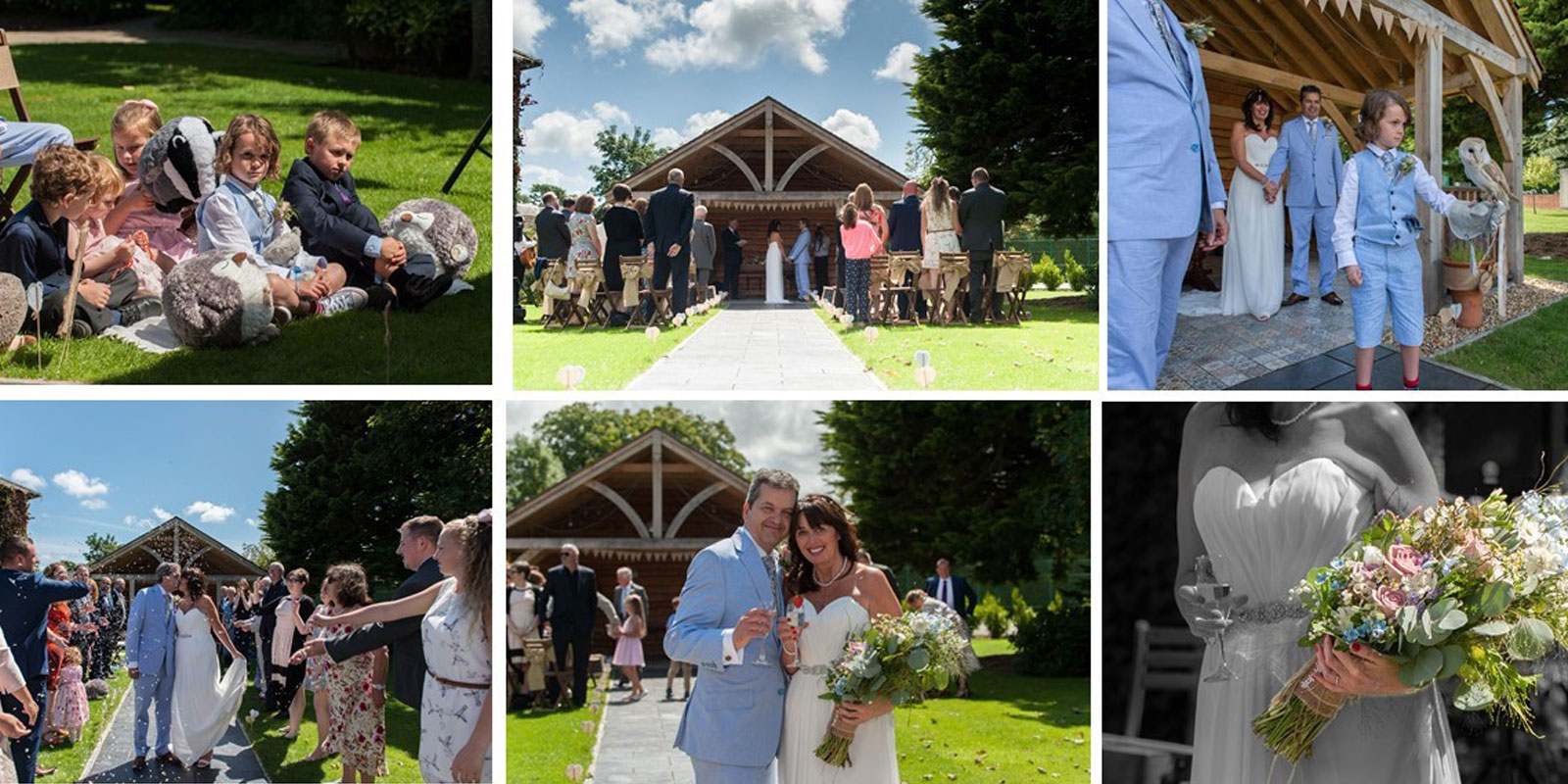 The wedding party stayed the night before and enjoyed a leisurely morning preparing for the ceremony. Lynn and Steve were mindful of their younger guests and provided them with plenty treats and entertainment. For the ceremony, the 8 youngsters were sat on soft blankets on the grass in front of the Pavilion, and each given a large plush woodland animal brought from Go Go Gadget, Festival Place in Basingstoke. The children loved them, as well as wrapped gifts of activity packs, nibbles, a craft table and an ever-popular bouncy castle, which kept them cheerful and entertained throughout the day.