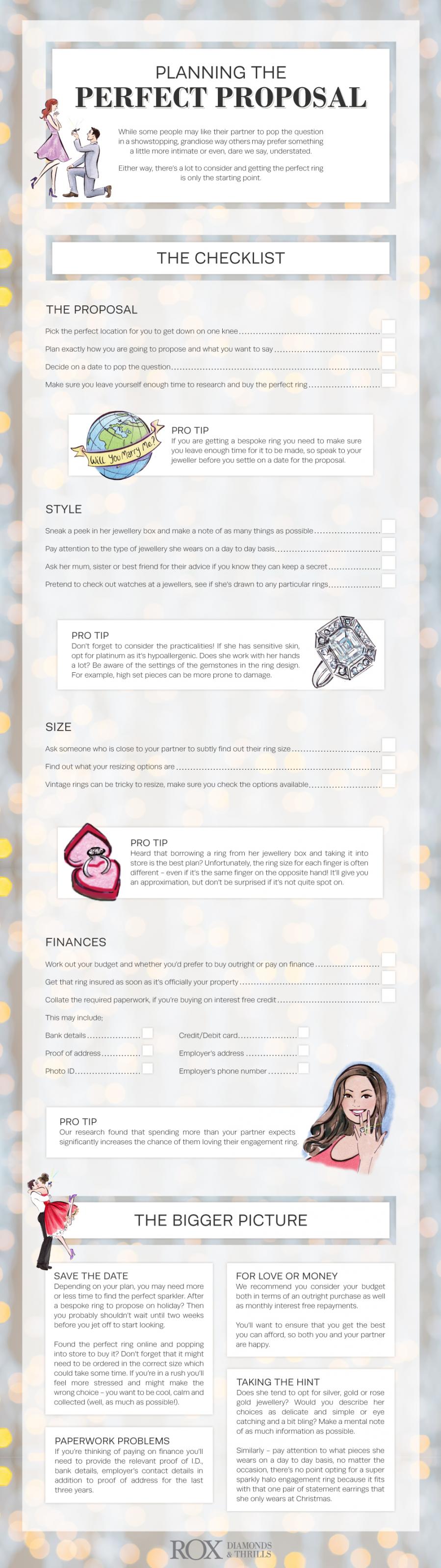 Having only scratched the surface of what you need to think about and plan before proposing, we’ve included ROX’s proposal planning checklist below. The checklist will help guide you through the process of popping the question. Including tips on how to find your partner's ring size to making sure you’ve left enough time so you can propose on that special day. Get reading...