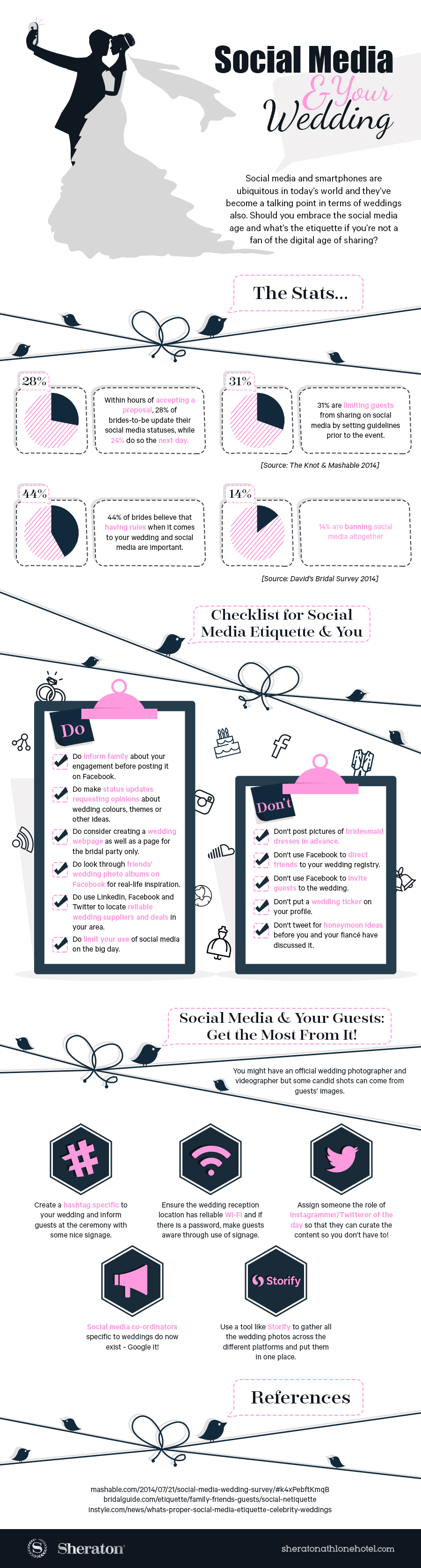 This infographic from the Sheraton Athlone Hotel highlights the issues surrounding modern day weddings and social media. It looks at the statistics in question; it gives some advice in terms of best practice when using social media for your wedding and it also highlights things you can do to make the most of anything generated on social media about your wedding. Check it out below.