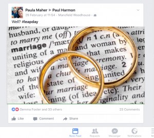 Picture the scene: I'm sitting in my slippers as I'm off work for the day and I'm binge-watching House on Netflix with a cup of coffee in one hand and Facebook on my mobile phone in the other.  A thought comes to me: wouldn't it be hilarious if I was to propose to my partner of twenty years on his public wall on Facebook? I mean, HILARIOUS!  He was in work, so unlikely to see it until lunchtime. Meanwhile, all our mutual friends would be posed to comment, eagerly awaiting his reply.