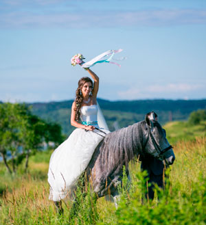 A horse and cart might be the traditional way to get around on your wedding day, but why not take a different approach and ditch the cart? Not only will your guests never forget your method of transport, but it would also make for some stunning photos. Channel your inner Maggie Carpenter (aka Julia Roberts from the 1994 romantic-comedy Runaway Bride) and create a real sense of drama on your trusty steed with a show-stopping gown and long, flowing hair.